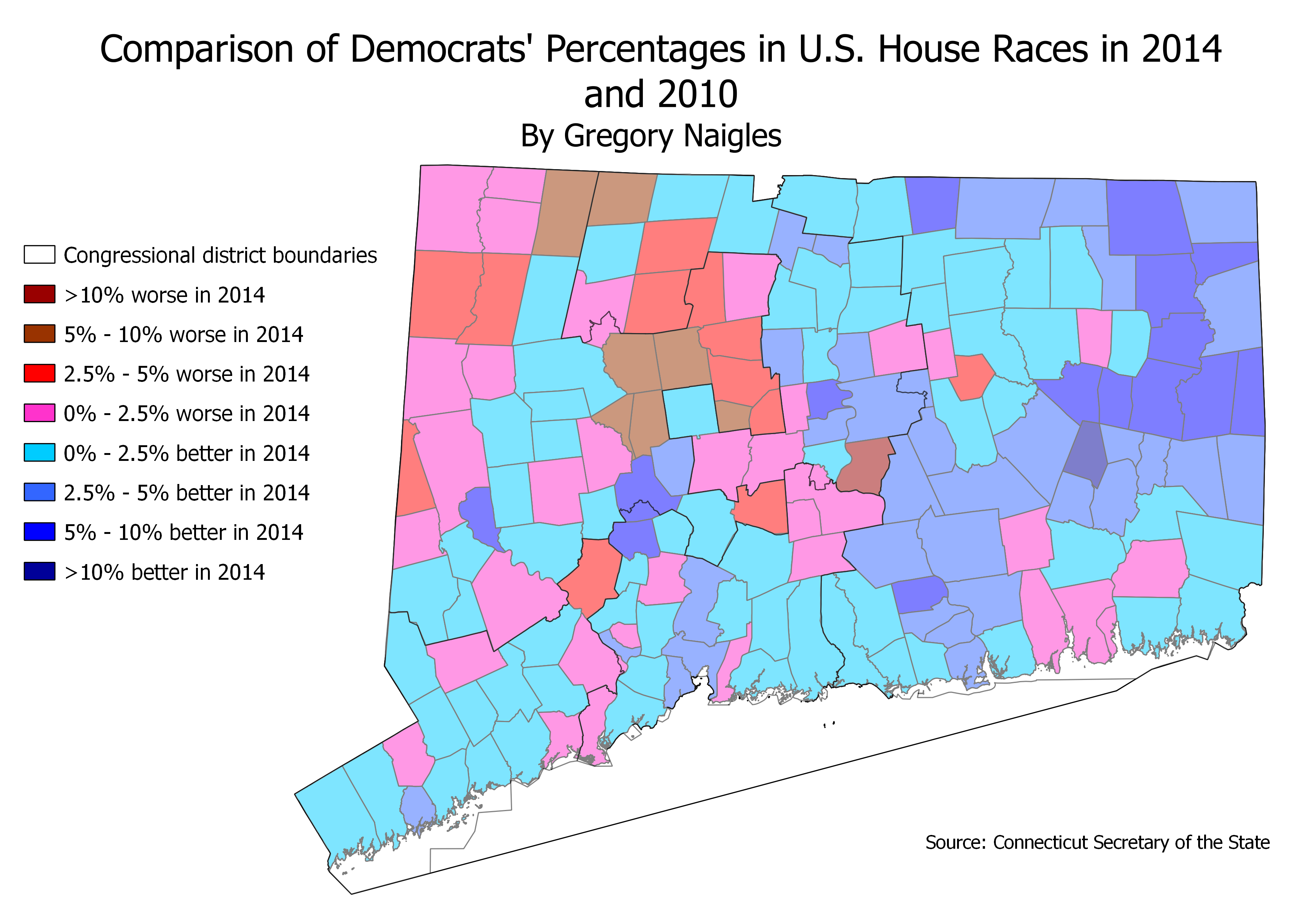 The 2014 elections were essentially a repeat of the 2010 congressional elections in Connecticut, as all five Democratic incumbents won re-election by similar or slightly greater margins than their districts saw in 2010. There were, however, several interesting differences between the two.