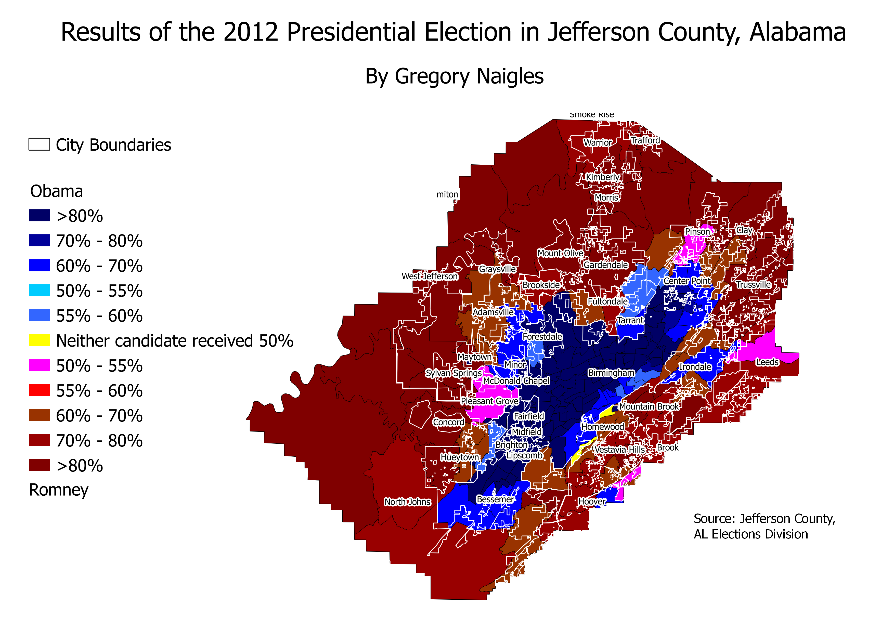 In this article, I analyze the precinct-level election results for both elections in Jefferson County, Alabama (the most populous county in Alabama, and home to Birmingham) to compare the performances of Barack Obama and Bob Vance, and to examine their coalitions to see where each outperformed the other.