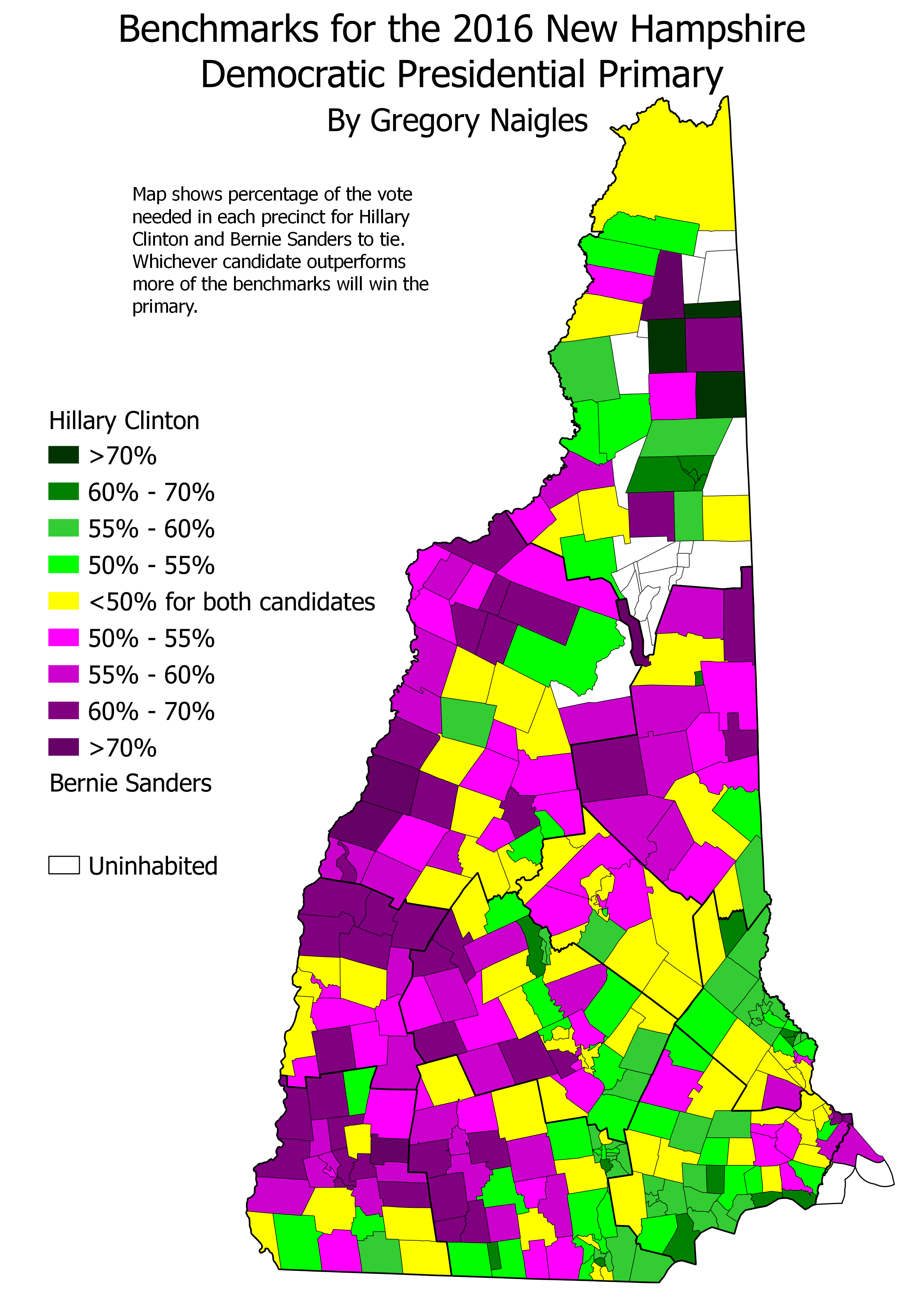 If Bernie and Hillary tie in New Hampshire while receiving a combined 95 percent of the vote, then they would each receive 47.5 percent of the vote. Thus, Bernie and Hillary will have to receive over 47.5 percent of the vote to win the primary. The following benchmarks for each town are calculated based on both candidates receiving 47.5 percent of the vote, therefore if one of the candidates is consistently outperforming the benchmarks, they will very likely win the primary.