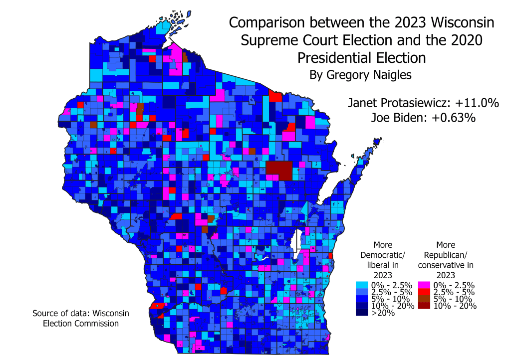 I hope these maps helped give you a better understanding of the 2023 Wisconsin Supreme Court election results, and the vote shifts and patterns behind them. As always, please leave a comment and let me know what you think!