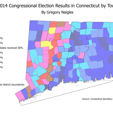 The 2014 elections were essentially a repeat of the 2010 congressional elections in Connecticut, as all five Democratic incumbents won re-election by similar or slightly greater margins than their districts saw in 2010. There were, however, several interesting differences between the two. Here is a map of the results by town (click on the maps … More Maps and Analysis of 2014 Congressional Elections in Connecticut
